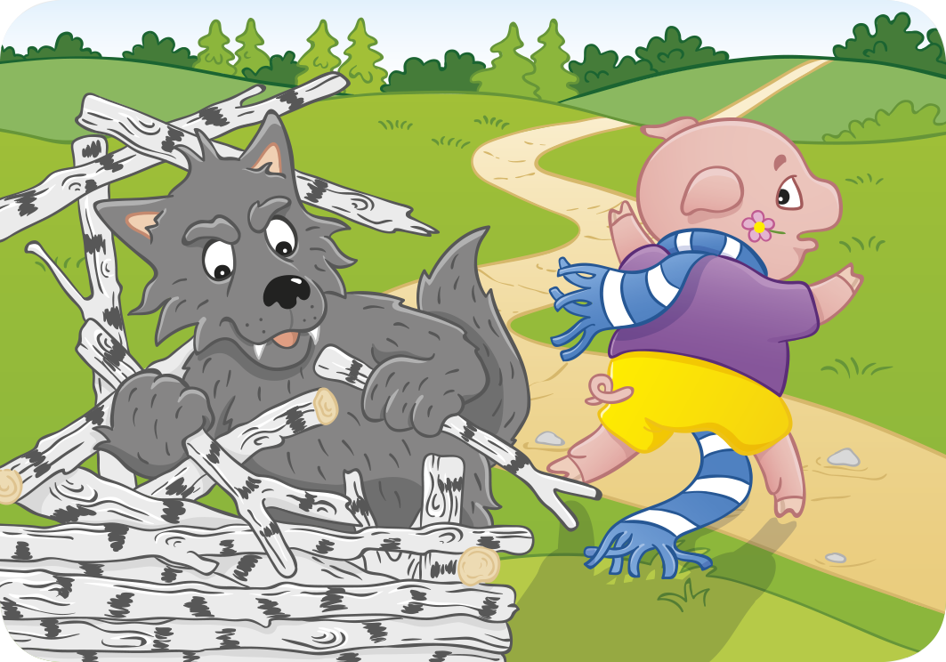 Ustrašené prasátko uteklo směrem k domečku z klacíků svého brášky.