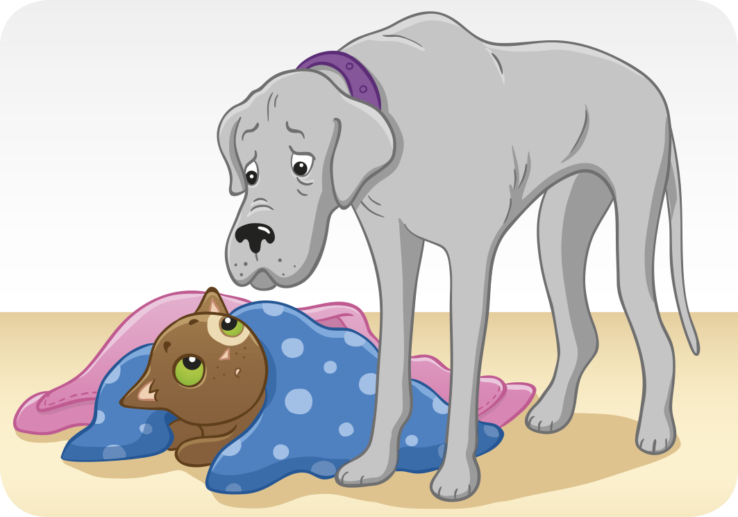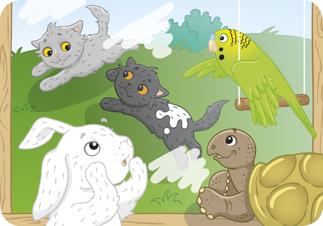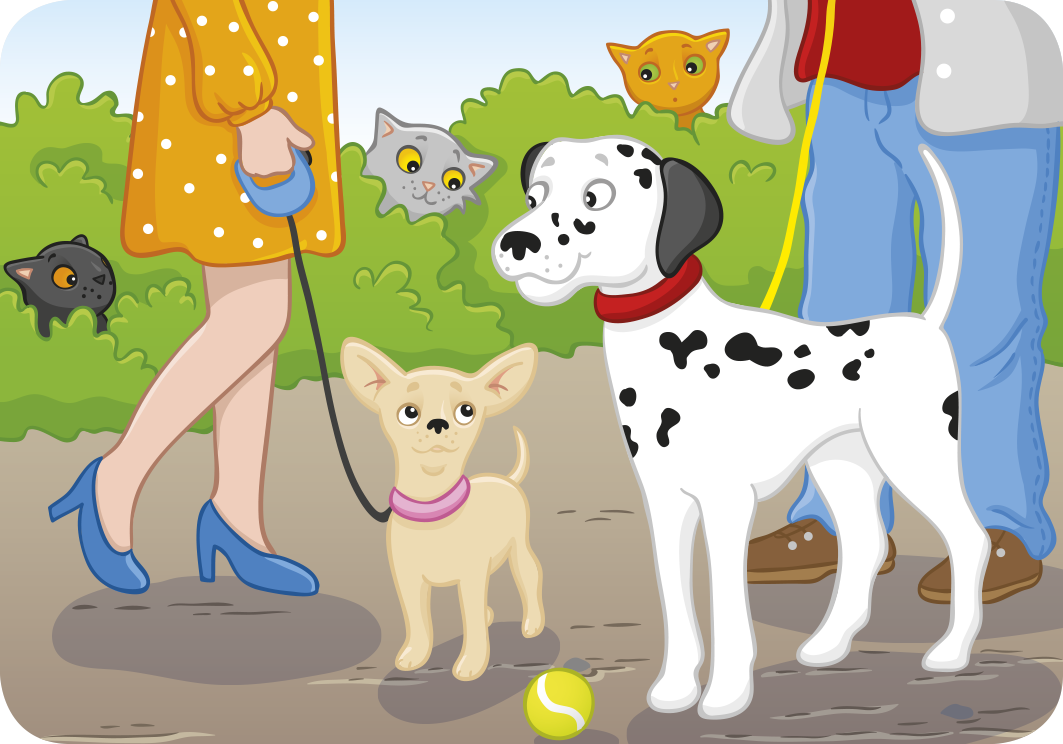 „Dnes budeme trénovat, jak se před pejsky schovat. Podívejte, moji milí, jak si pejsci vykračují. Až je pán z vodítek pustí, a na chvilku z očí spustí, zavětří vás co by dup, nezbude z vás ani chlup! Tak se mějte na pozoru, když na vás psi valí oči, zachrání vás skok nahoru, moc vysoko nevyskočí.“