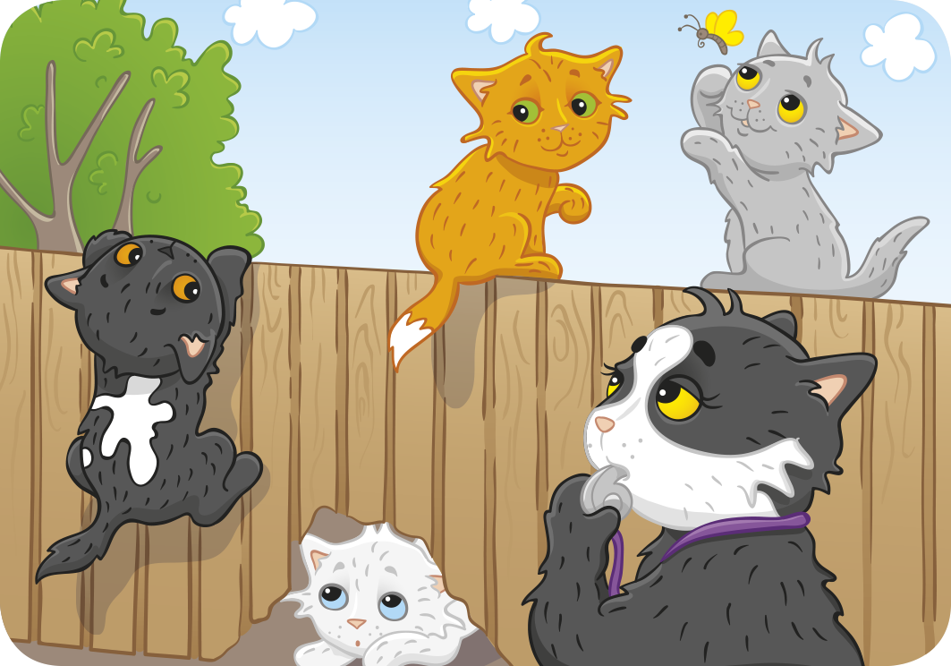 Kočky pilně trénují, vlevo vpravo běhají. Svižně na plot skákají, a po stromech šplhají.
