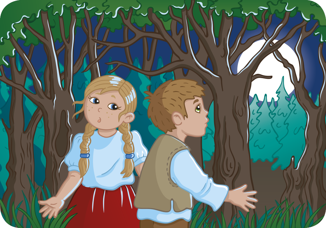 Najednou se setmělo. V tu chvíli si děti uvědomily, že si musejí pospíšit zpět na paseku za tatínkem. Ve spěchu však sešly z cesty. Na jejím konci se ocitly na úplně jiné pasece.